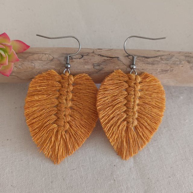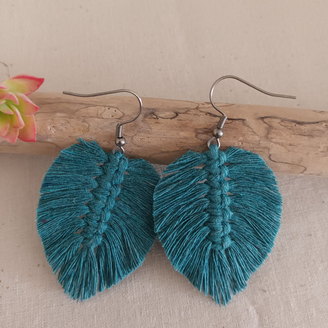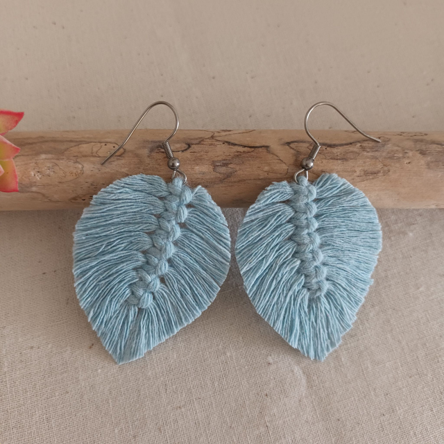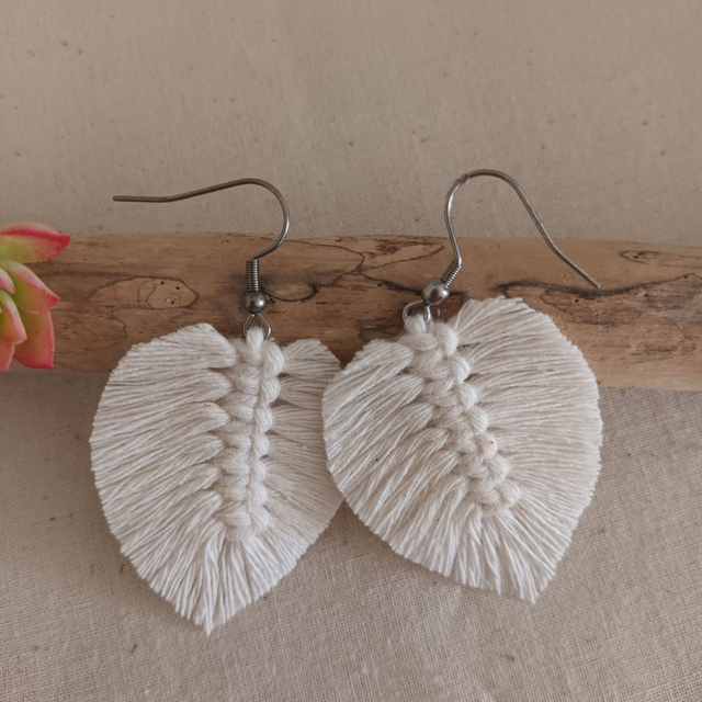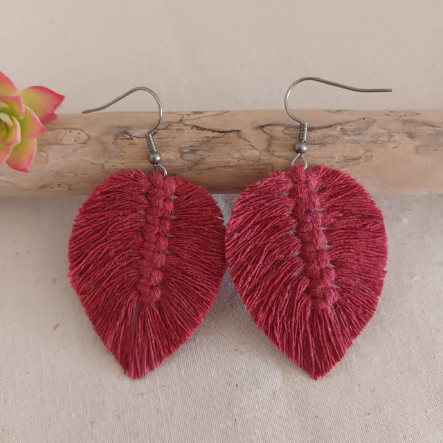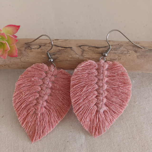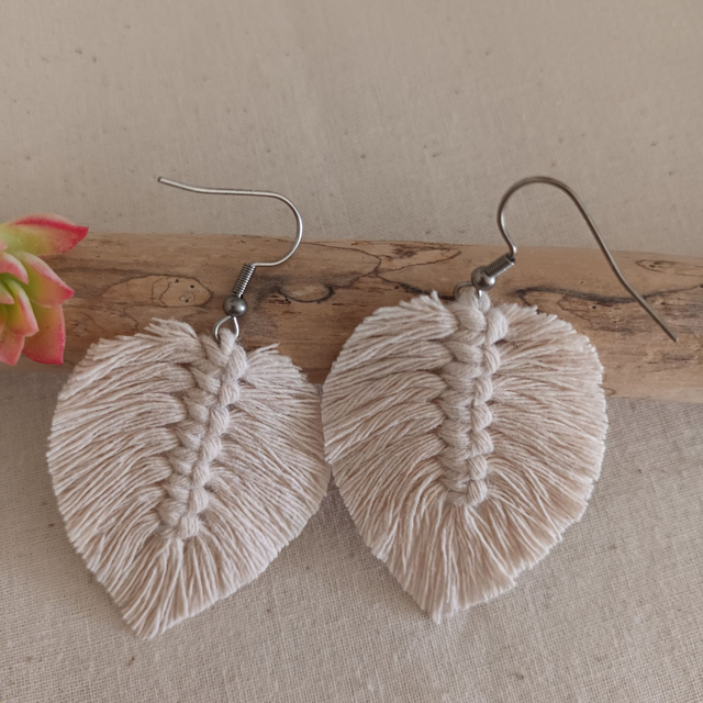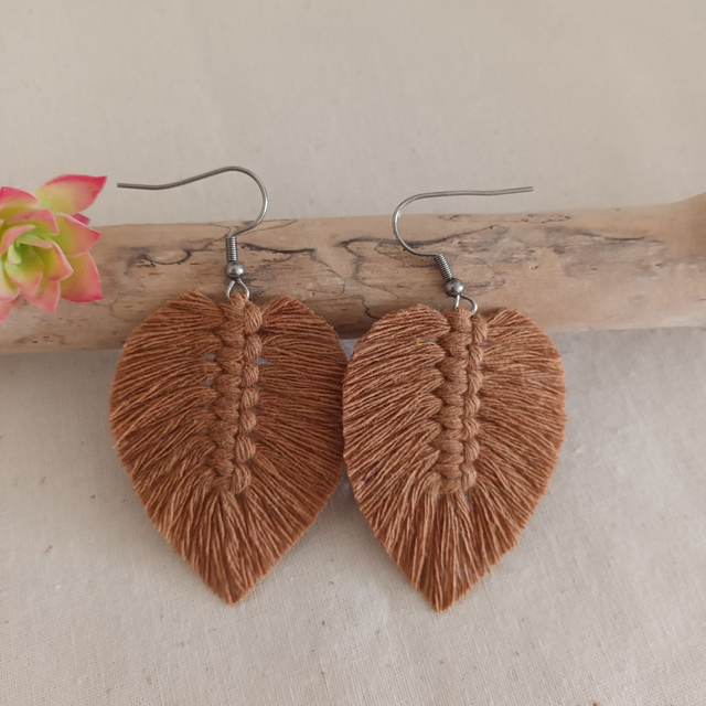 Ajoutez une touche de nature à votre style avec ces jolies boucles d’oreilles en macramé. Délicatement conçues en forme de feuille, chaque pièce est unique. elles sont réalisées à la main avec de la corde de coton recyclé pour un accessoire à la fois chic et éco-responsable.