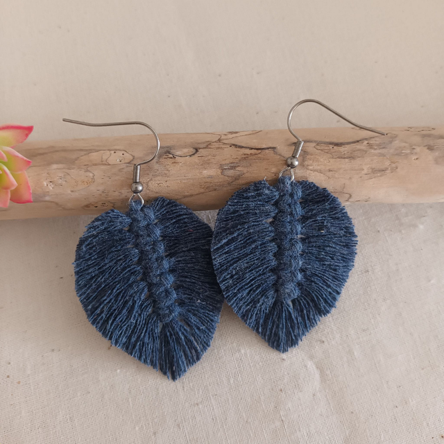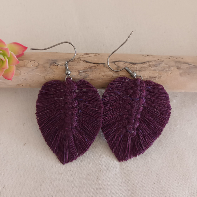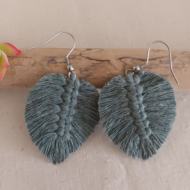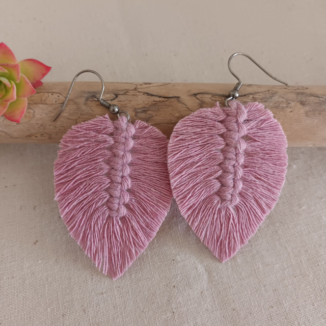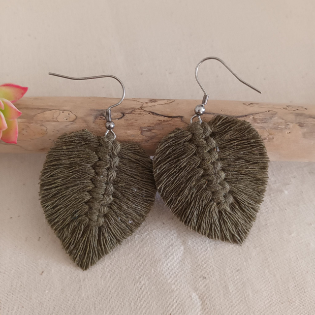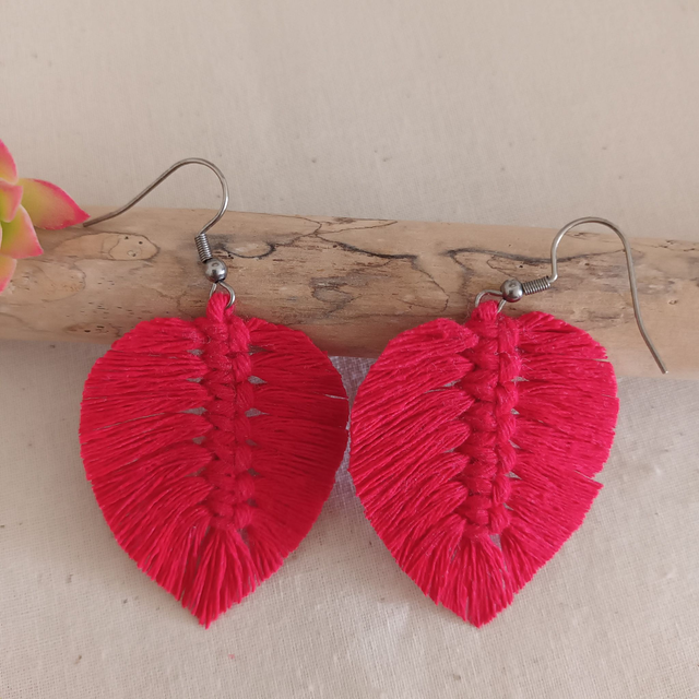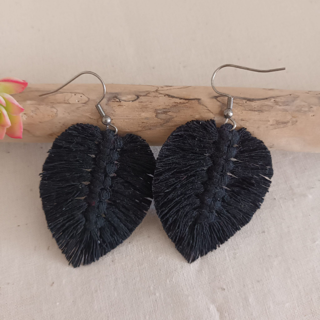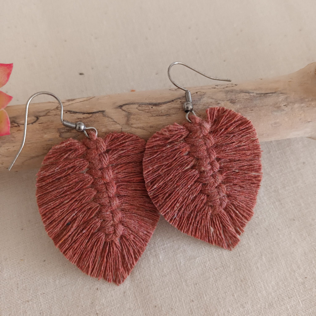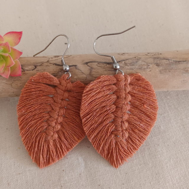 Ajoutez une touche de nature à votre style avec ces jolies boucles d’oreilles en macramé. Délicatement conçues en forme de feuille, chaque pièce est unique. elles sont réalisées à la main avec de la corde de coton recyclé pour un accessoire à la fois chic et éco-responsable.