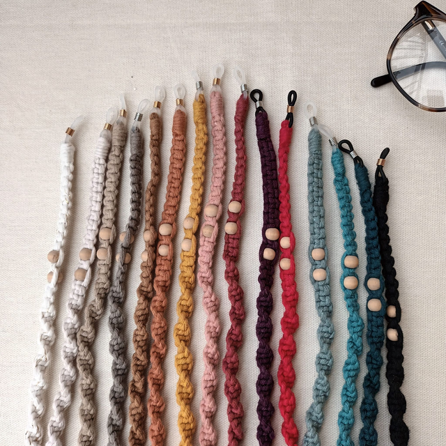 Les cordons de lunettes ne sont pas seulement un accessoire pratique, mais aussi un atout de mode original, parfait pour personnaliser votre look .Ils sont disponibles dans de nombreuses couleurs pour s'adapter à toutes vos envies.Vous pouvez également les associer à mes boucles d'oreilles en macramé ou pour les amateurs de lecture, à un marque-page en macramé.