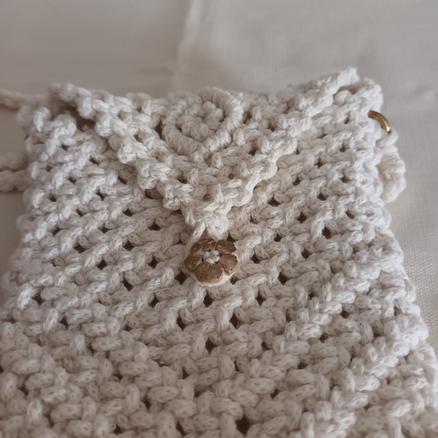 La pochette se ferme grâce à un joli bouton en bois de coco en forme de fleur, apportant une touche bohème et naturelle à l’ensemble. Légère, cette pochette se porte en bandoulière et s'adapte à toutes les tailles grâce à son cordon réglable.